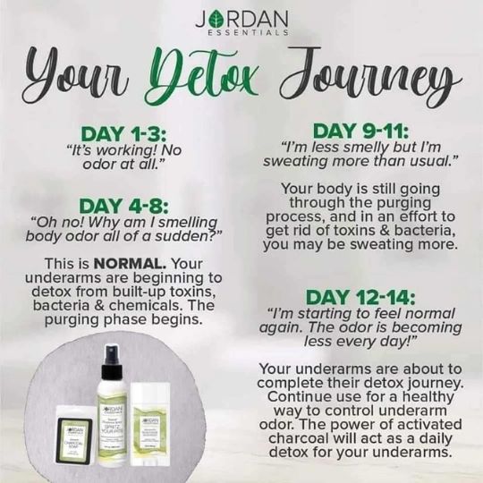 Jordan Essentials offers an aluminum-free deodorants and Spritz Your Pits spray that uses natural ingredients—including activated charcoal and the phyto-essential blend of natural botanicals—to support your body’s natural detox process and control odor without clogging your sweat glands. But when you first switch, your body goes through a detox period. Here’s a breakdown of what you might experience: